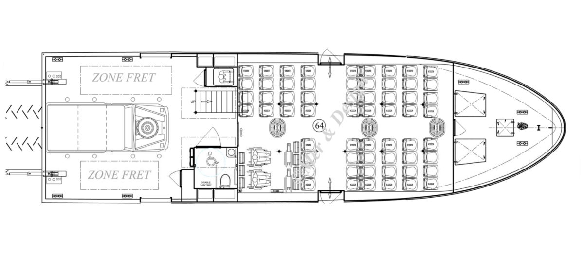 Passengers experience numerous improvements (Hybrid Parallel Propulsion, quietness thanks to Soundproofing). Thanks to its solutions proposed by shipyard maintenance is made easy (engine hatch opens-up for easy access, working bench is set in the front compartment, Pumps in place to renew engine oil, etc.)