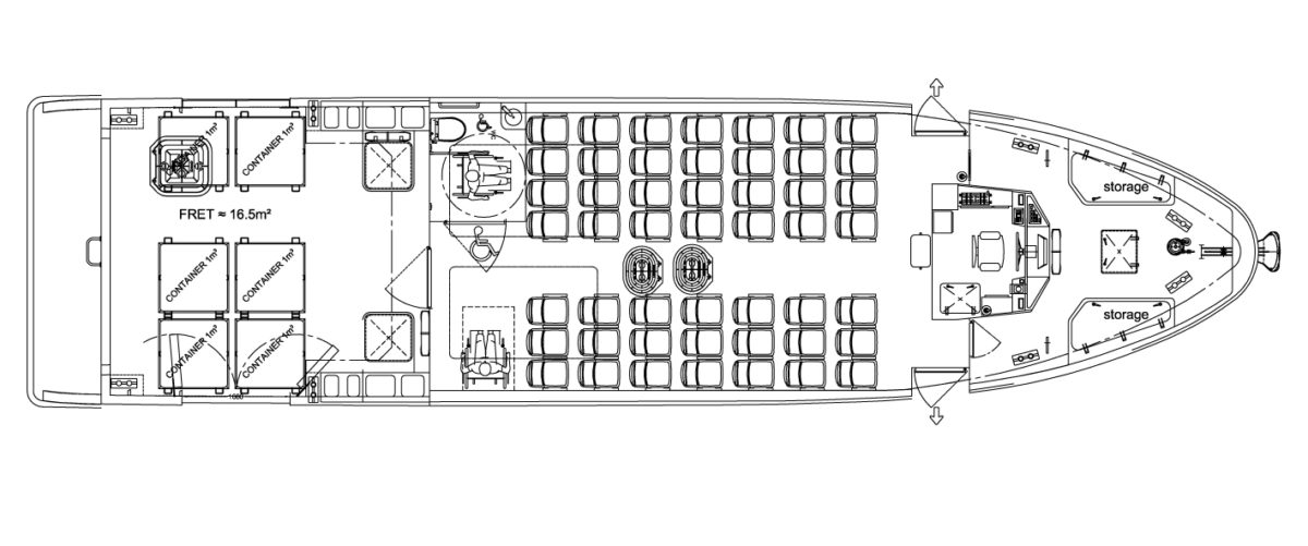 Son plan de pont rationnel et efficace permet une bonne circulation des passagers, un soin particulier a été apporté à la disposition et aux conforts des assises.