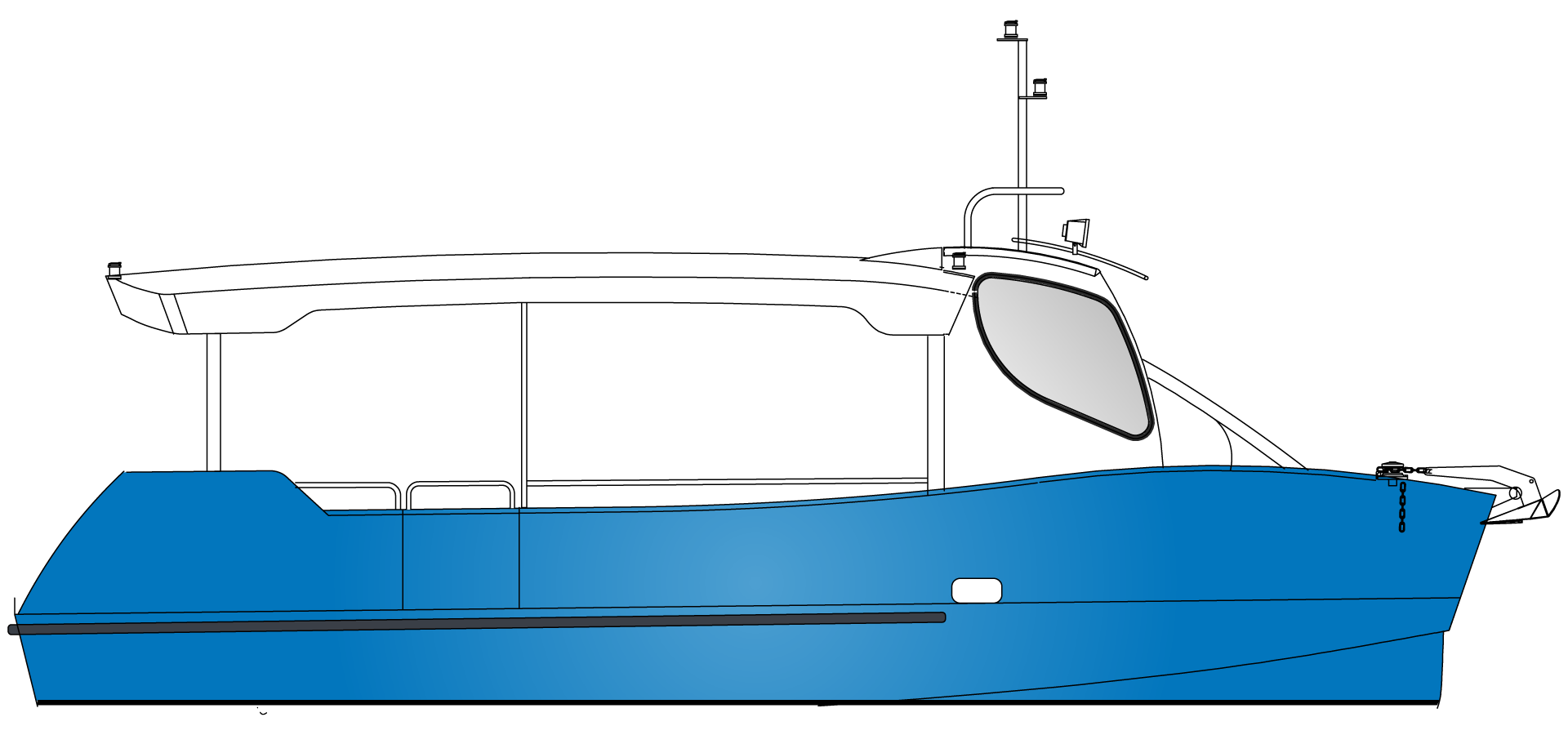 Cette Vedette en Aluminium de 8.95 m de long et 3.50 m de large est destinée au Transport de Passagers. elle est conçue pour une homologation aux normes françaises en maritime comme en fluvial.