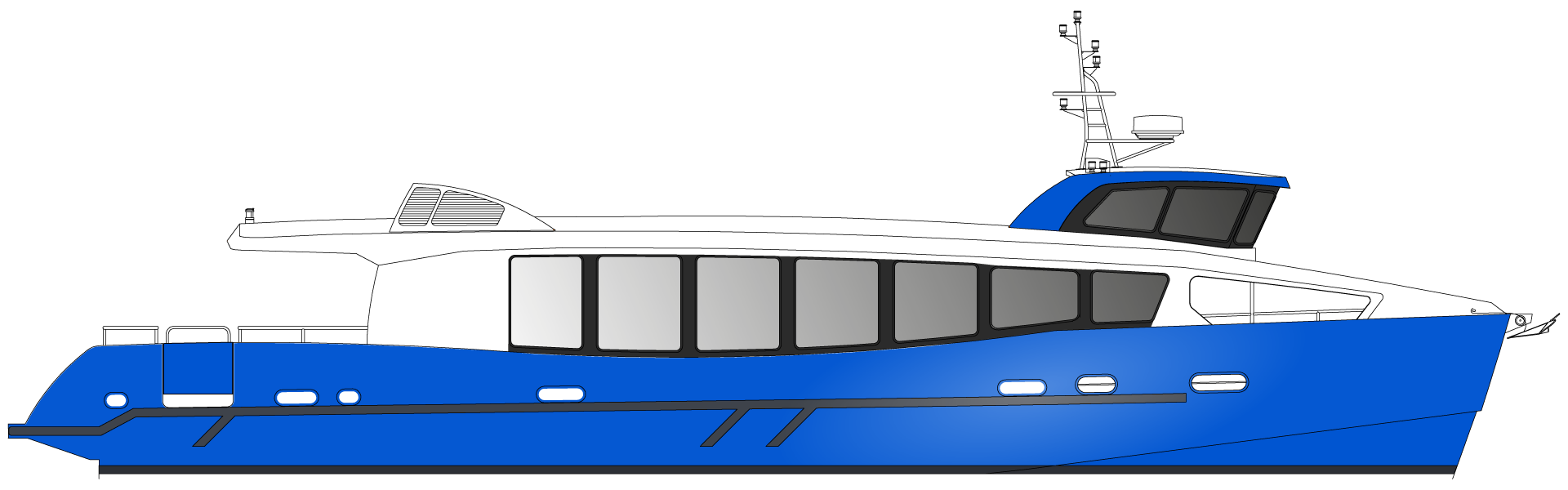 Cette vedette en Aluminium de 19.40 m de long et 4.70 m de large est destinée au Transport de Passagers. Elle est conçue pour une homologation aux normes françaises en maritime comme en fluvial.